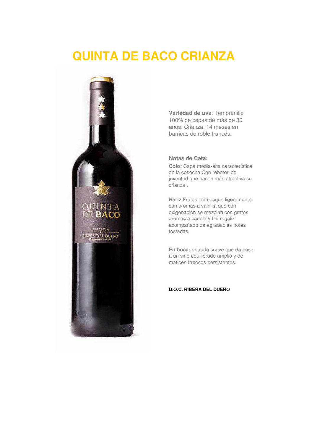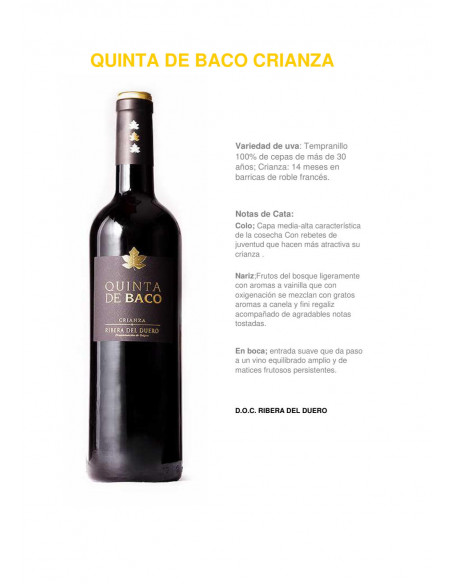 Vino tinto Quinta de Baco Crianza , selección de las mejores parcelas de Tinta del País de la bodega.
